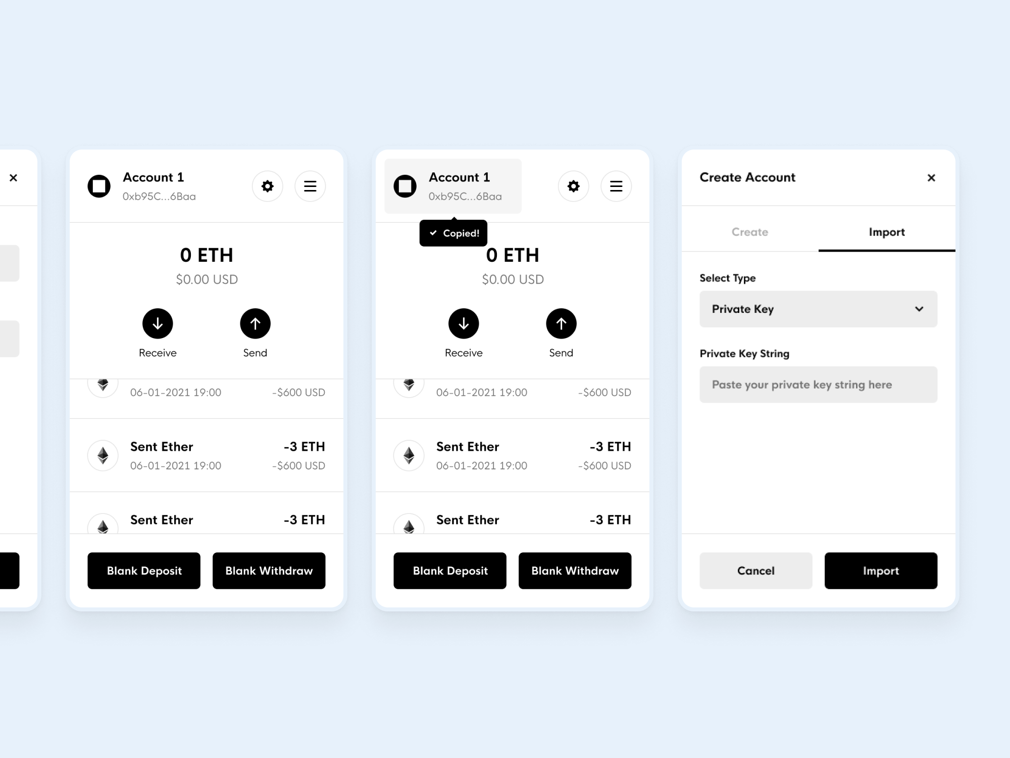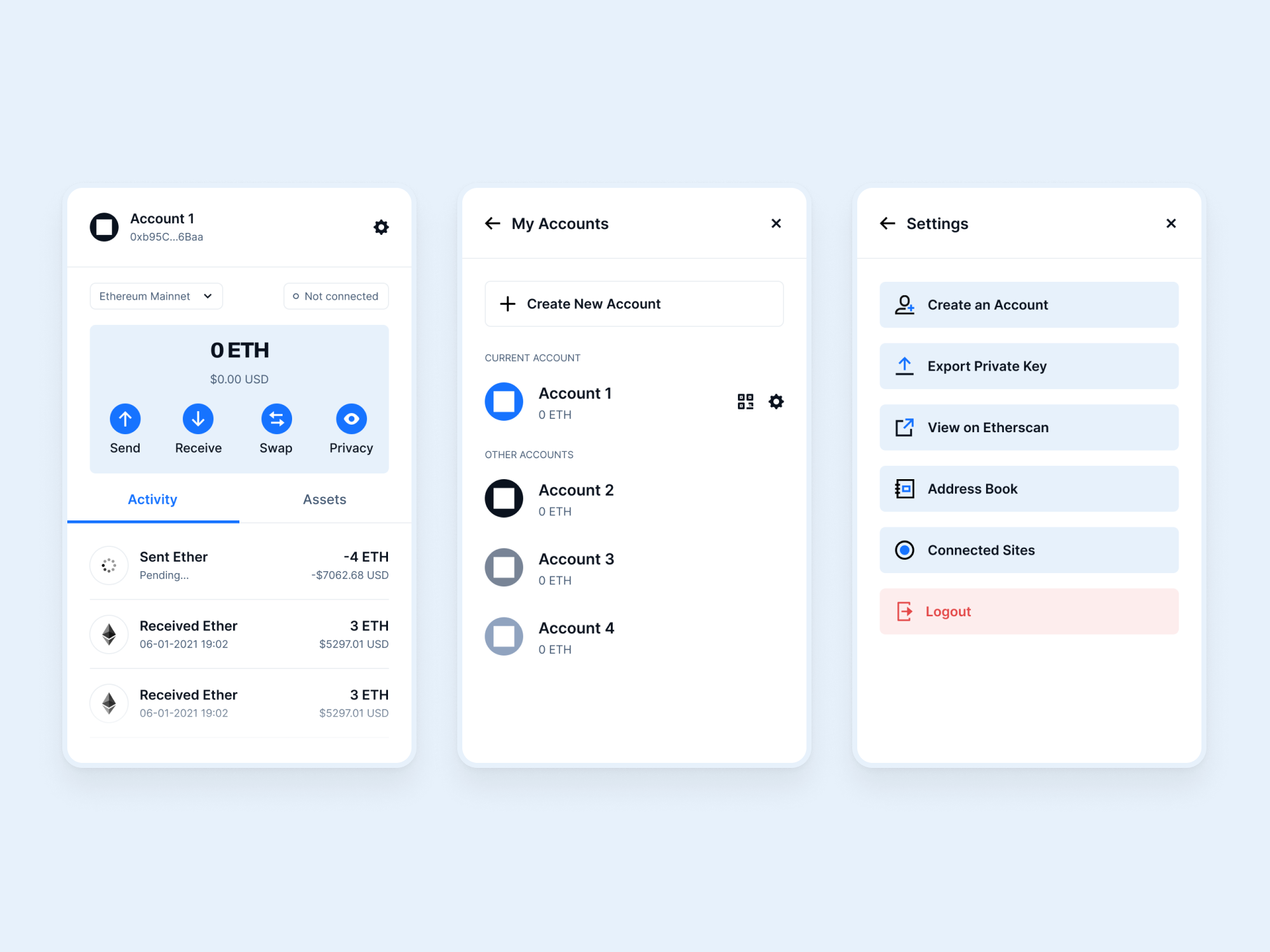 The market has leaders like MetaMask and Coinbase wallets. I took best practices from existing products and tried to solve problematic points with better design solutions for existing and new users.