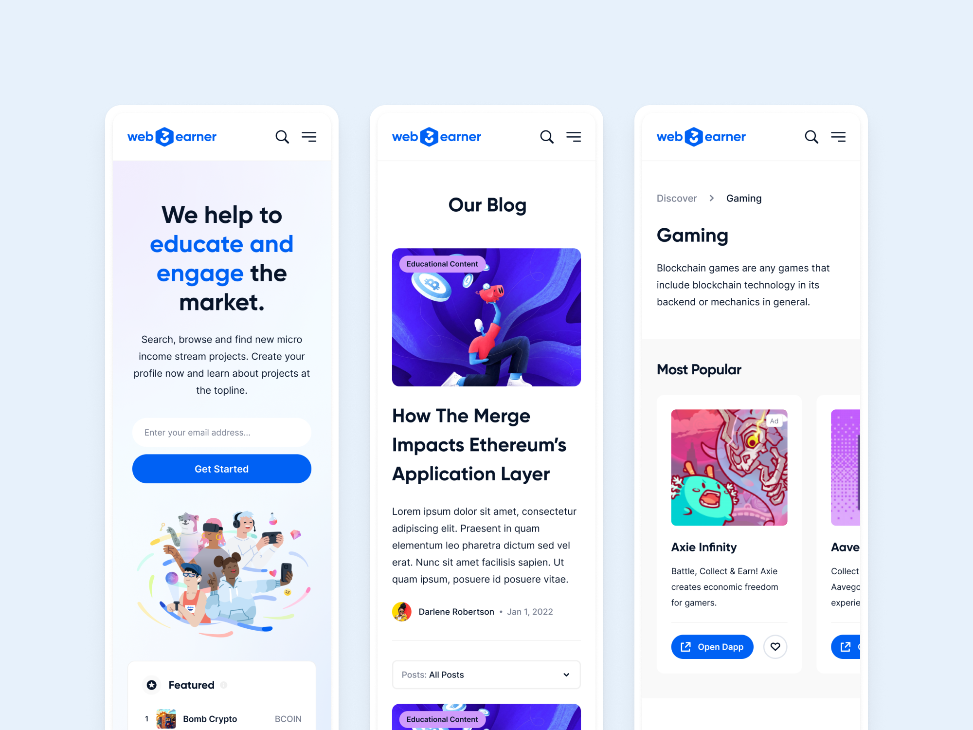 Through careful consideration of user experience (UX) principles, responsive design, and an eye-catching visual aesthetic, my goal was to design a website that would inspire users to actively explore the potential of Web3, and ultimately drive engagement and adoption of Web3Earner as a go-to resource for discovering exciting earning opportunities on the Web3 platform.